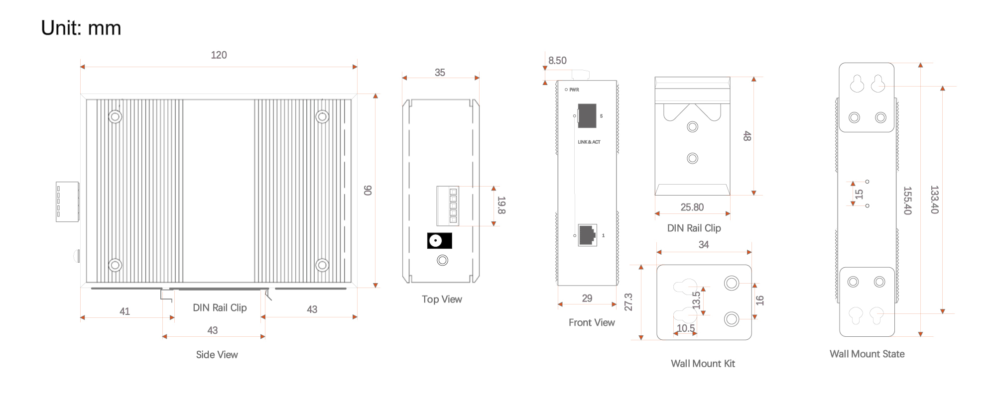 | Installation Kit | 1 x Caps, plastic, for SFP Slots Or 1 x Caps, plastic, for SC fiber port Or 1 x Caps, plastic, for ST fiber port 2x Wall-Mount Kits 1x DIN Rail Clip |